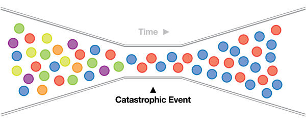 Due to a dramatic reduction in population, some genetic profiles (represented here by the yellow, orange, green, and purple circles), are lost. Subsequent generations inherit only the DNA of the survivors. ! (This is an interesting argument because the arrival of the first Americans across Beringia is a textbook example of a genetic bottleneck. It is commonly accepted that a small group of people either passed through a briefly open corridor between ice sheets or followed a coastal route, and then spread rapidly throughout the Americas over a period of about 2,000 years, where they continued to flourish until the arrival of European conquerors. If a bottleneck is such a dire problem their DNA should be a complete mystery because of genetic mutations in the intervening millennia, yet we are still able to easily trace their genetic lineage directly back to Siberia and to that Mal’ta skeleton from 24,000 years ago, despite the founder effect, despite the bottleneck, and despite a timescale that is vastly deeper than that of the Book of Mormon. If the consequences of bottleneck and founder effect are so dire, the greatest mystery in science today would be where any of the people of the Americas come from. But it’s not a mystery. Yes, some mutations cause the loss of some individual genetic base pairs, specifically those that don’t contribute to the survival of the organism, but the vast majority of the genetic material is passed on from generation to generation)